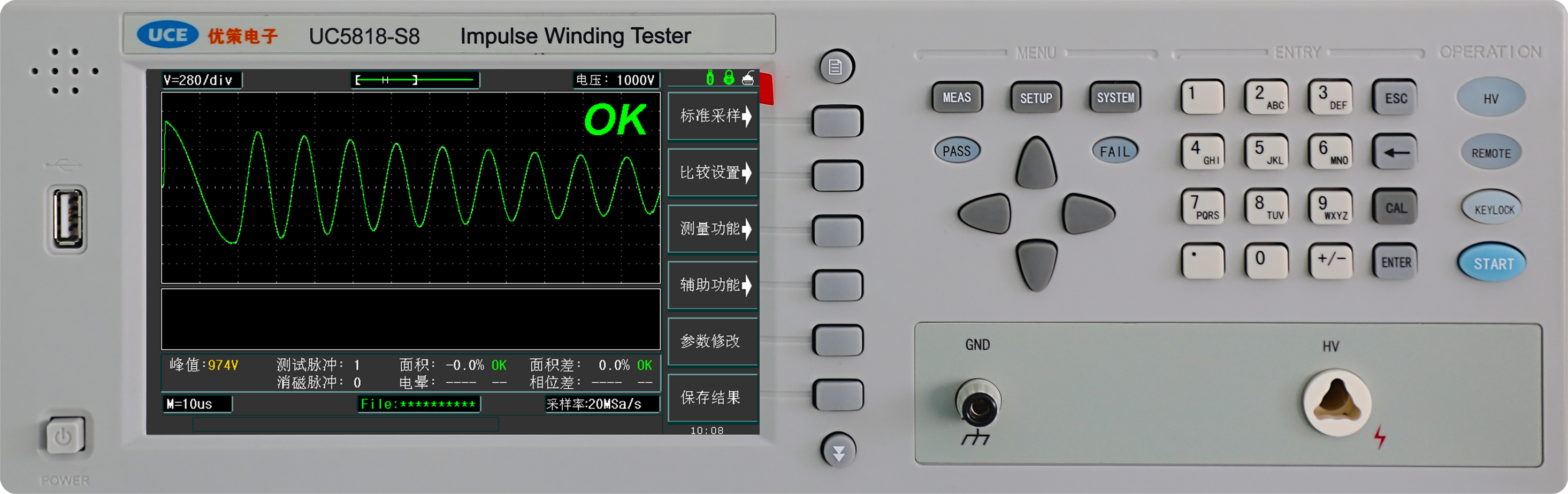 UC5815-S8 八通道脈沖式線圈測試儀采用當(dāng)前流行的7寸800x480彩色TFT LCD顯示器,同時儀器還采用了主流的高性能32位處理器和高速FPGA;UC5815-S8提供200Msps的采樣率以及6.5kBytes的采樣存儲深度,使測試更加精準(zhǔn),同時該系列儀器還采用了高穩(wěn)定性的高壓電源和可控硅模塊控制的高壓開關(guān)器件,從而大大提高了該產(chǎn)品測試的精準(zhǔn)性、穩(wěn)定性和可靠性。該系列儀器提供了當(dāng)前流行的所有接口功能,可方便的與PC進行數(shù)據(jù)通訊和遠程控制以及圖形的實時保存。